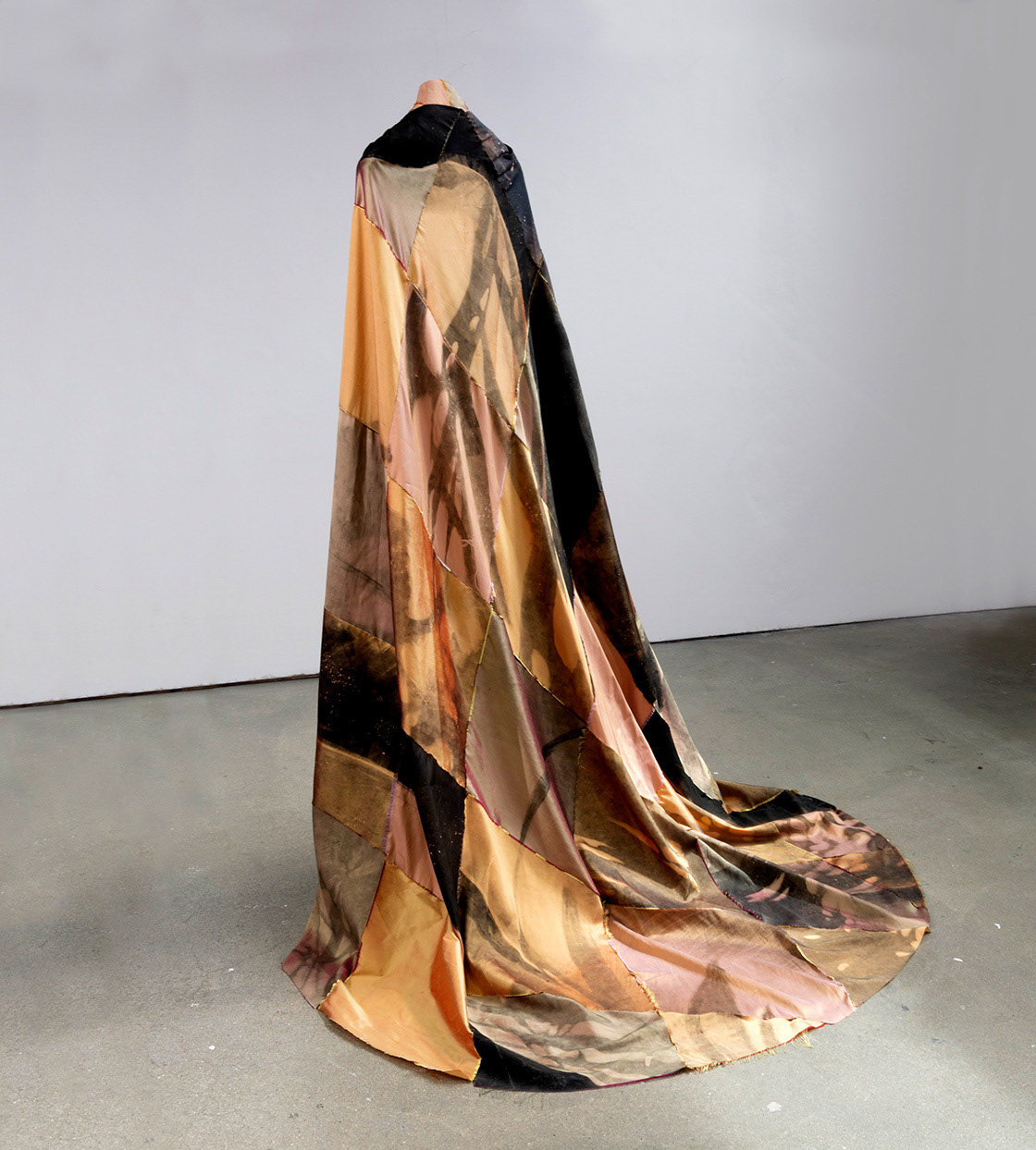 Hand sewn cape, monoprint on silk